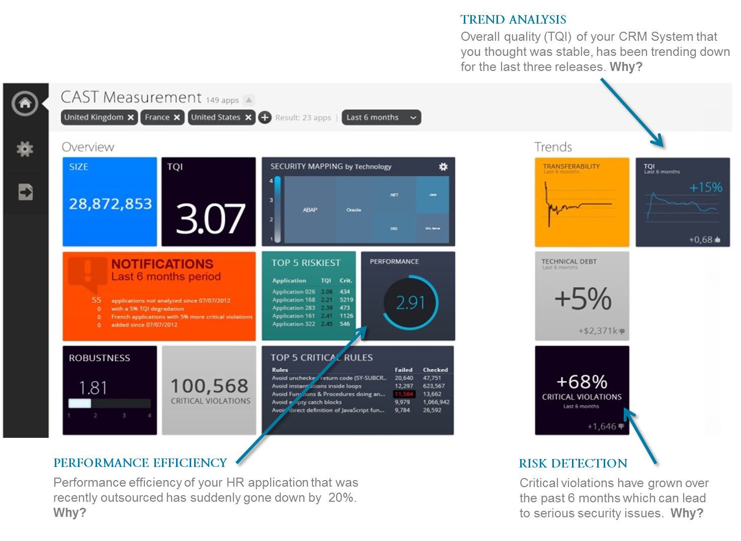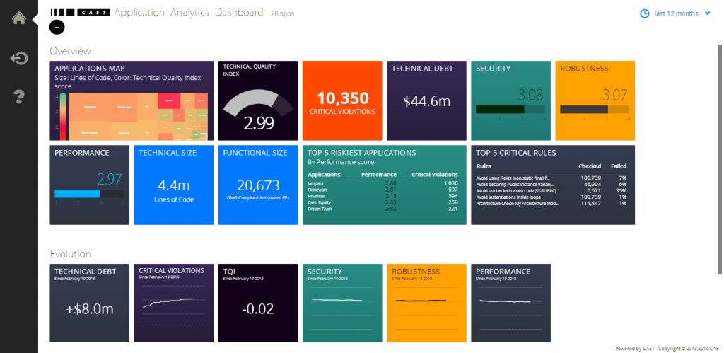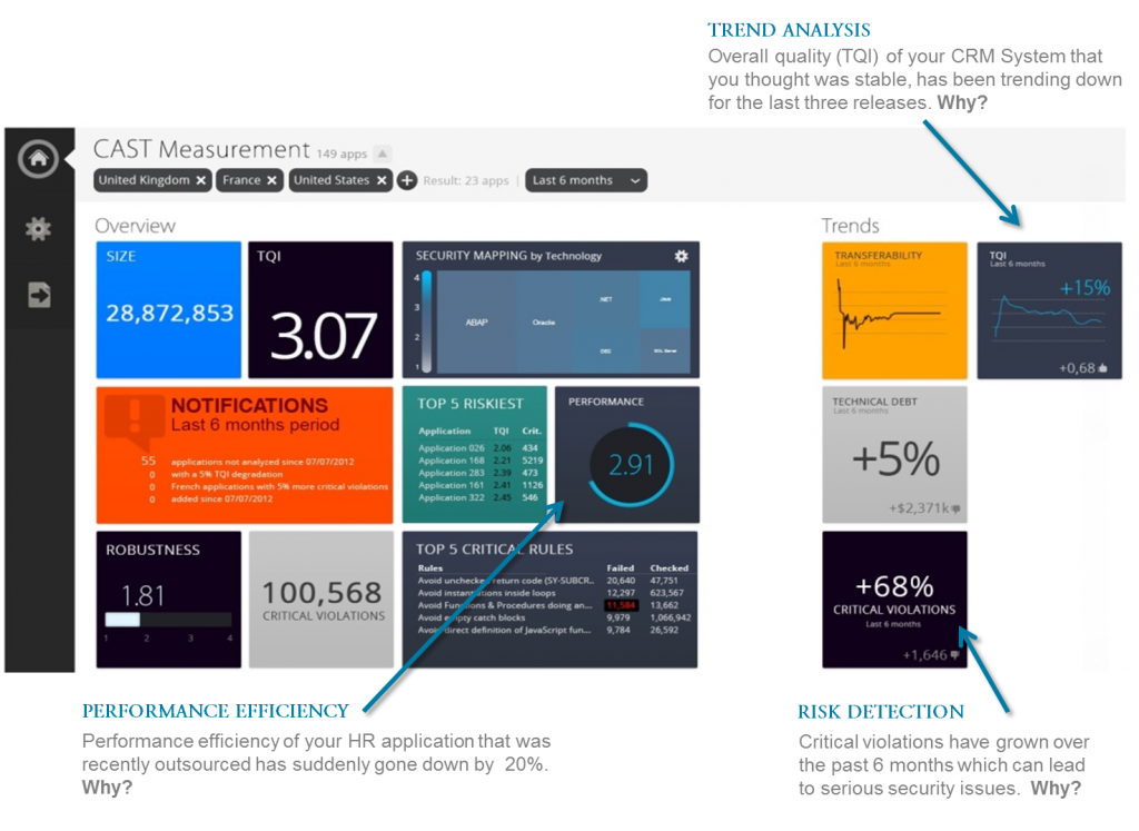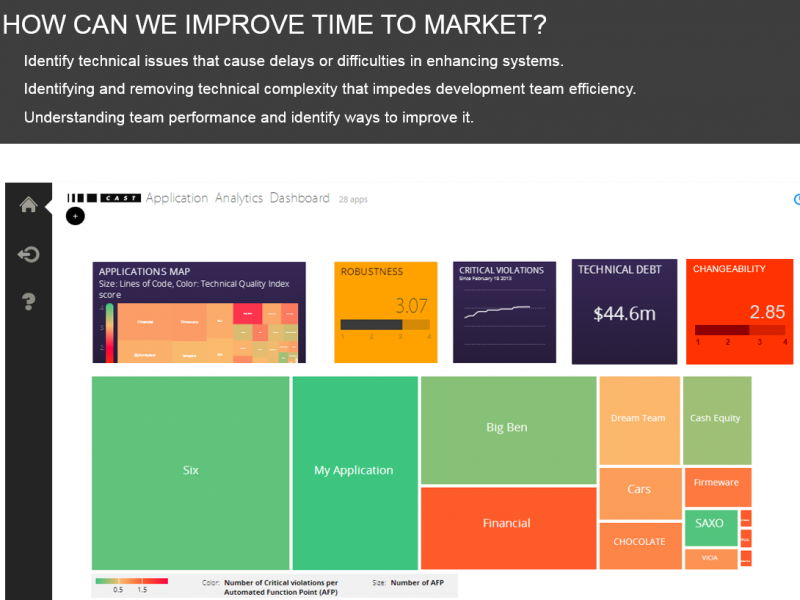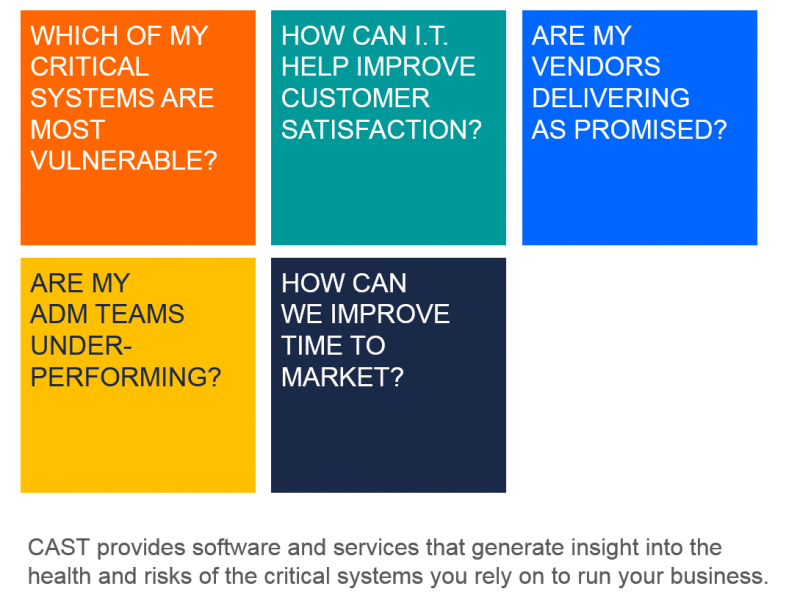 Over 30% of production problems in business applications arise from the structural quality of code or non-functional defects. These issues directly impact the business and can be greatly reduced with automated software analysis and measurement to identify these defects earlier in the development cycle and eliminate waste in application development. CAST helps significantly reduce the exposure to software failures, improve time to market, and reduce development and maintenance costs.